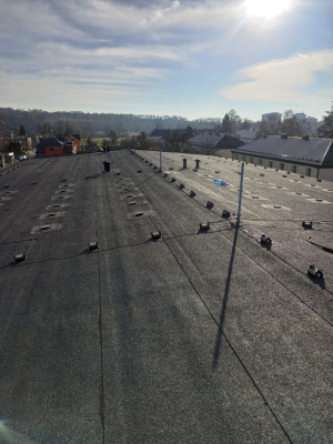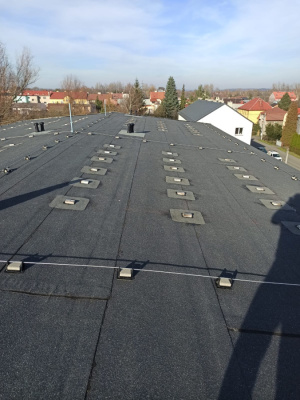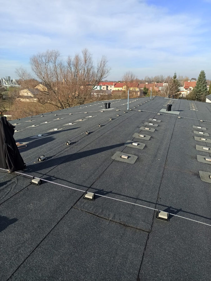 Kotevní body byly instalovány do dřevěného podkladu, což zajistilo pevné uchycení a dlouhodobou stabilitu celé konstrukce. Tento způsob kotvení je ideální pro střechy s asfaltovou izolací, kde je potřeba spojit mechanické kotvení s plnou vodotěsností.