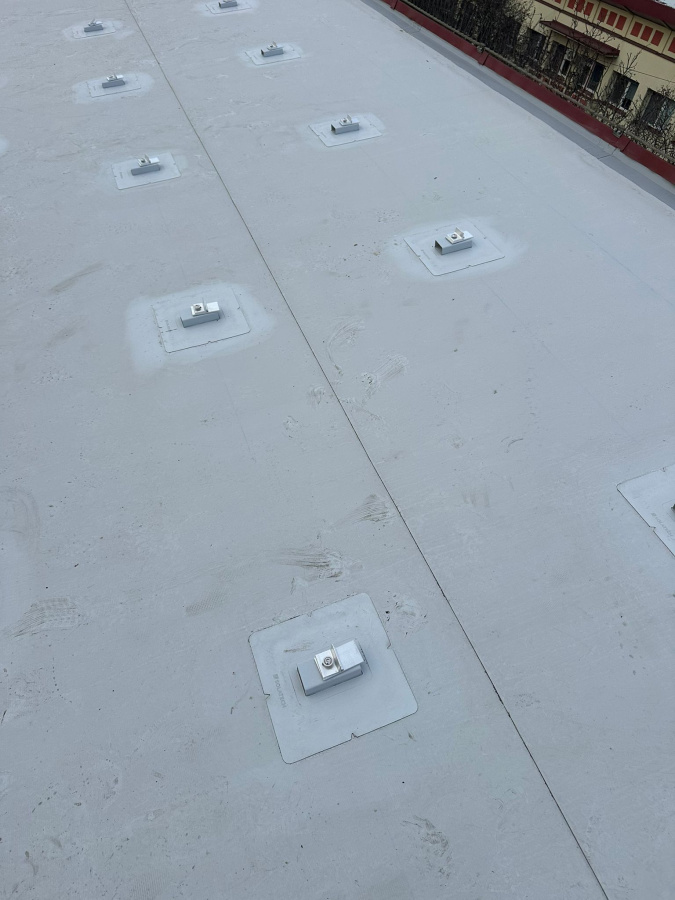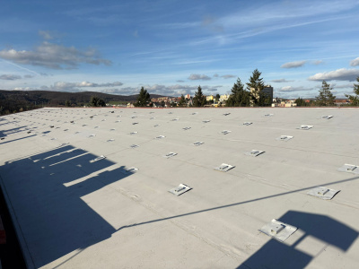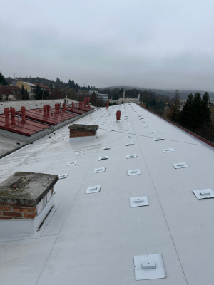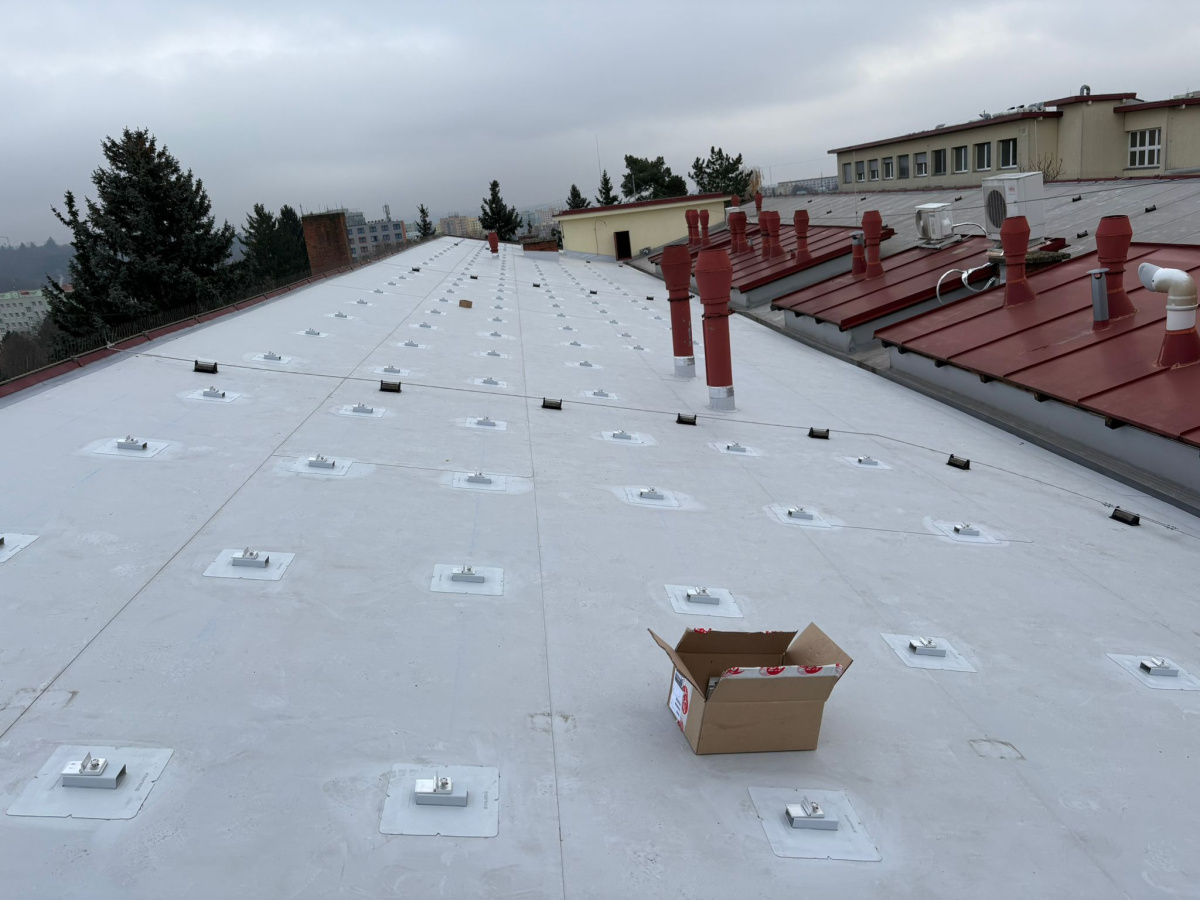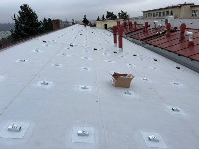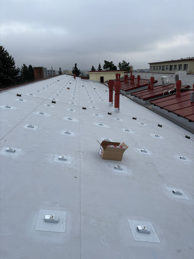 Na budově výzkumného ústavu v Brně bylo instalováno celkem 450 ks kotevních prvků SOLATECH DIM PVC. Před realizací proběhla tahová zkouška, která ověřila únosnost podkladu a umožnila správné navržení vhodného kotevního prvku.