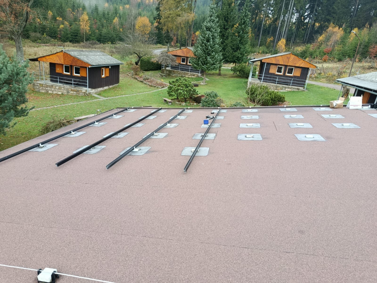 Pro tuto zakázku byl použit kotevní systém SOLATECH DIM BIT vybavený navařovací asfaltovou manžetou, která zajišťuje spolehlivé a vodotěsné napojení na asfaltovou střešní krytinu.